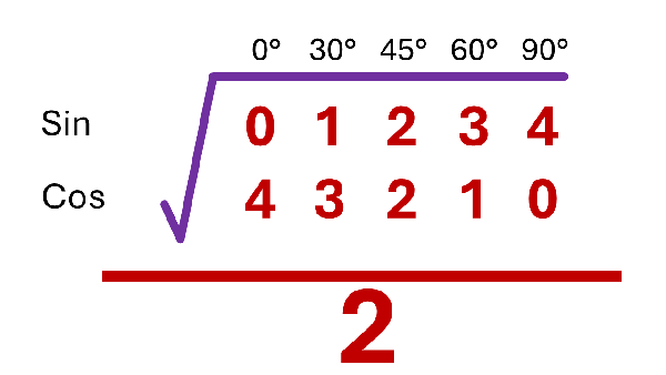 For \(\sin 60^\circ\): look down from \(60^\circ\) to the Sin row → you get 3.
